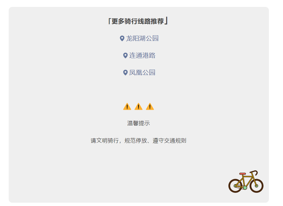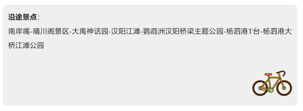 假期余额不足,汉阳美景仍盛。来汉阳,给你一份骑行地图,用一次骑行,告别这个留下太多回忆的春天。扶好车龙头,蹬上脚踏板,和汉阳君一起,在风中,一路畅行无阻,心无旁骛。