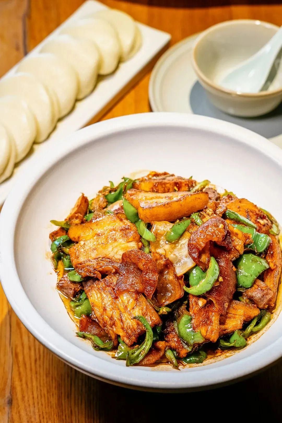 “农家带皮肉”也是拿手好菜,五花肉大片而不肥腻,和青椒一起包进切好的馒头里,变成一块中式小汉堡,同时满足碳水和肉欲,湘菜又被玩成了新花样~