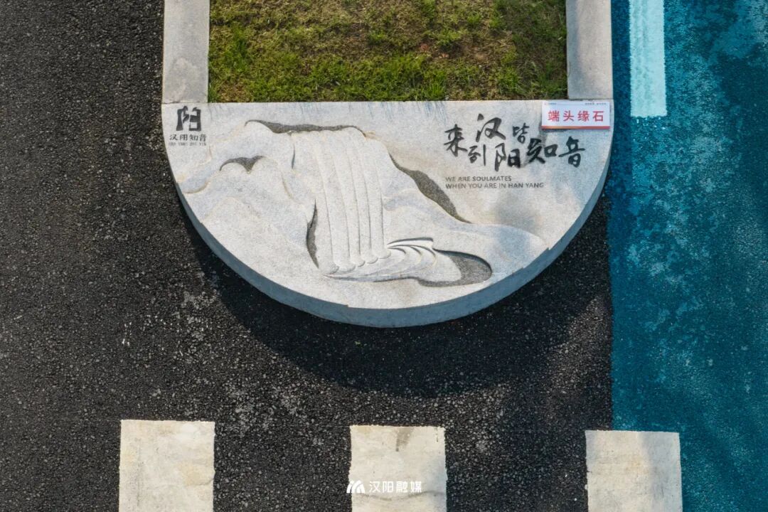 △知音大道(蟠龙路-金龙路),绿化带端头缘石刻有高山流水之意的图案和“来到汉阳皆知音”的文艺字。