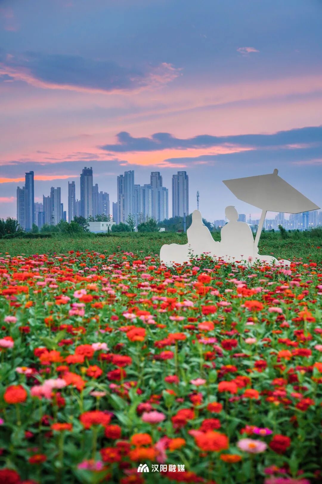 “太出片啦!”10月1日,汉江湾桥汉阳桥头的花田花海,3万平方米的百日草,晚霞似花、花映晚霞,刷屏游客“朋友圈”。