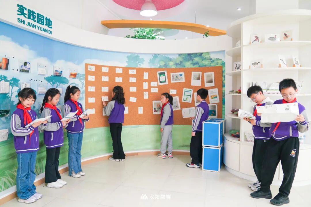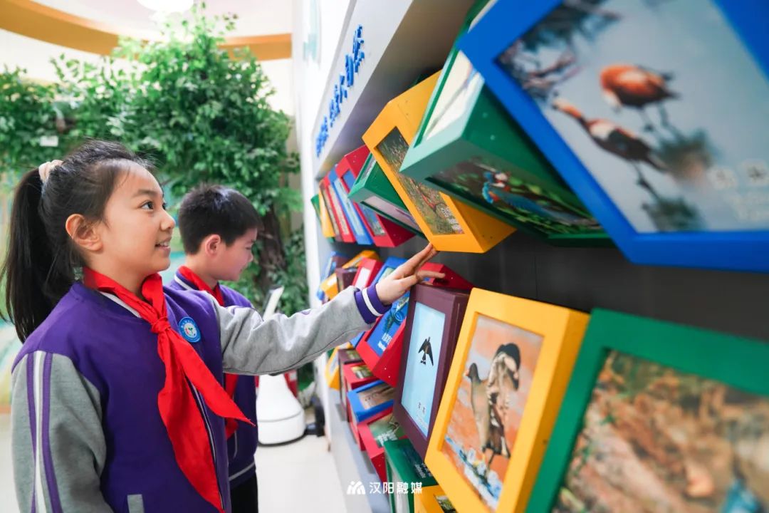 继续往里走,来到“实践园地”,学生们的文字、绘画作品挂满整墙,创意十足、精彩纷呈。作品墙一侧的书架上,摆放有印有湿地鸟类的卡片,只需用手机或者平板“扫一扫”,就可看到鸟儿的三维图像、听到鸟儿叫声,还可参与答题了解鸟类习性,既有趣好玩又能增长知识。