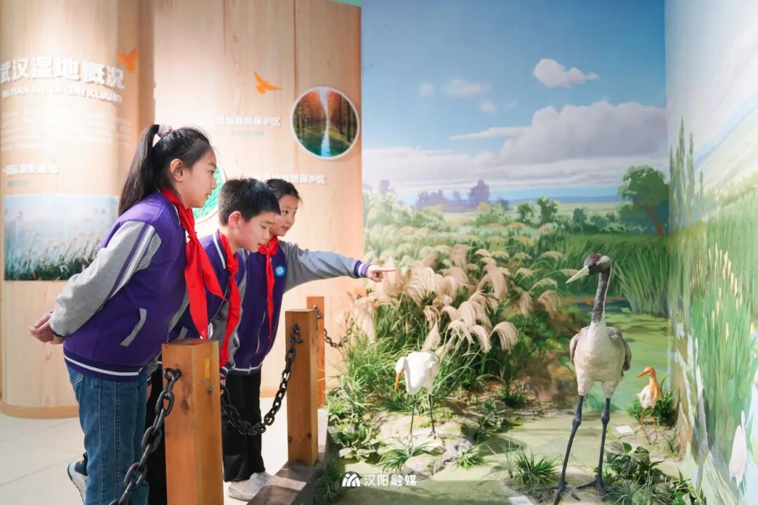 湿地生态体验馆于2023年9月建成,面积200多平方米,由模拟的湿地场景、湿地鸟类、湿地昆虫、湿地鱼类和湿地植物五个部分组成,通过标本、模型设置,结合文字、影像、声音等数字表现手段,还原湿地生态情景,打造了一方自然教育“教与学”的场地。