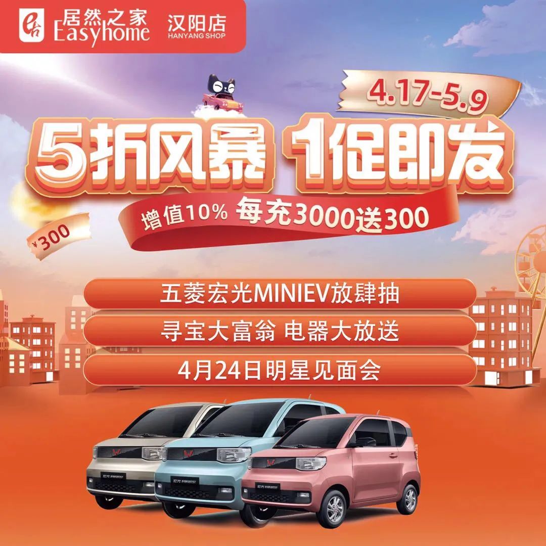 5月9日进行网红电动车五菱宏光MINIEV抽奖活动,凭邀约卡兑换抽奖券一张或活动期间购物满1000元兑换抽奖券一张,多买多兑,中奖率更高哦