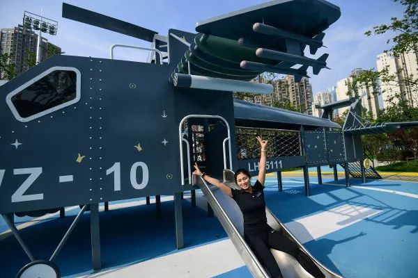 儿童娱乐区内,游乐设施被建造成直升机、运输机、导弹等形状