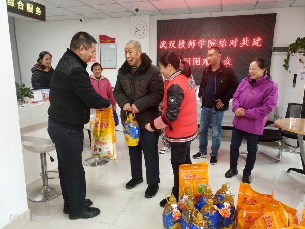 12月17日上午,黄金口社区共建单位武汉技师学院在职党员走进社区慰问了田爱珍、朱小玉、张建萍等10户困难家庭,为每户送上米、油慰问品,并鼓励他们勇敢面对生活困难,积极努力生活。(汪佩)