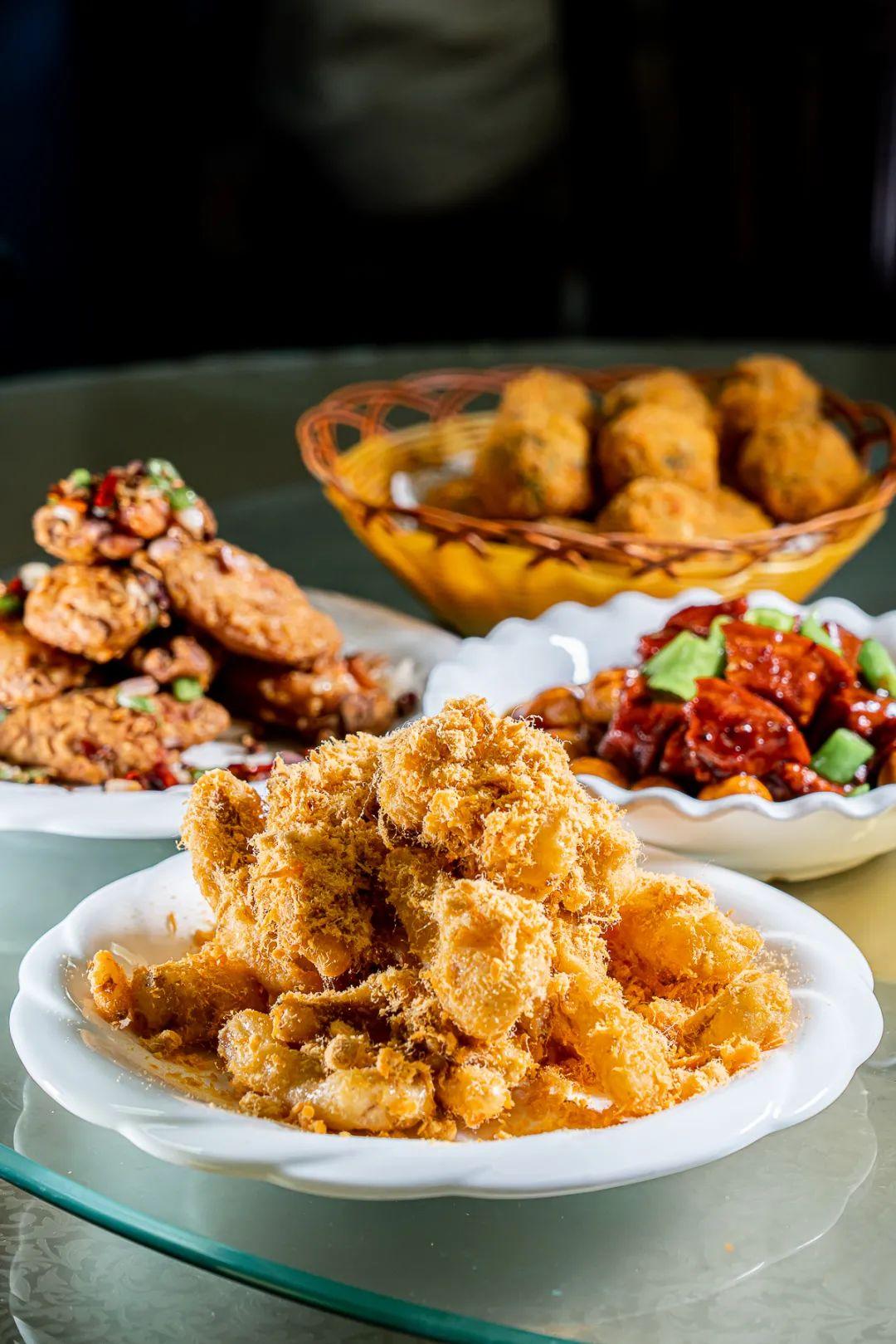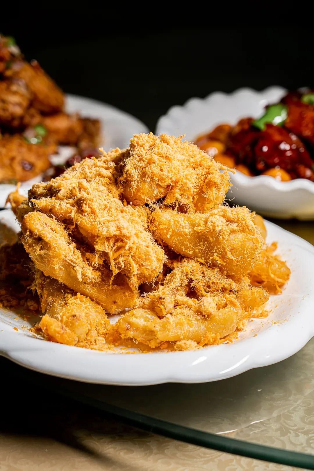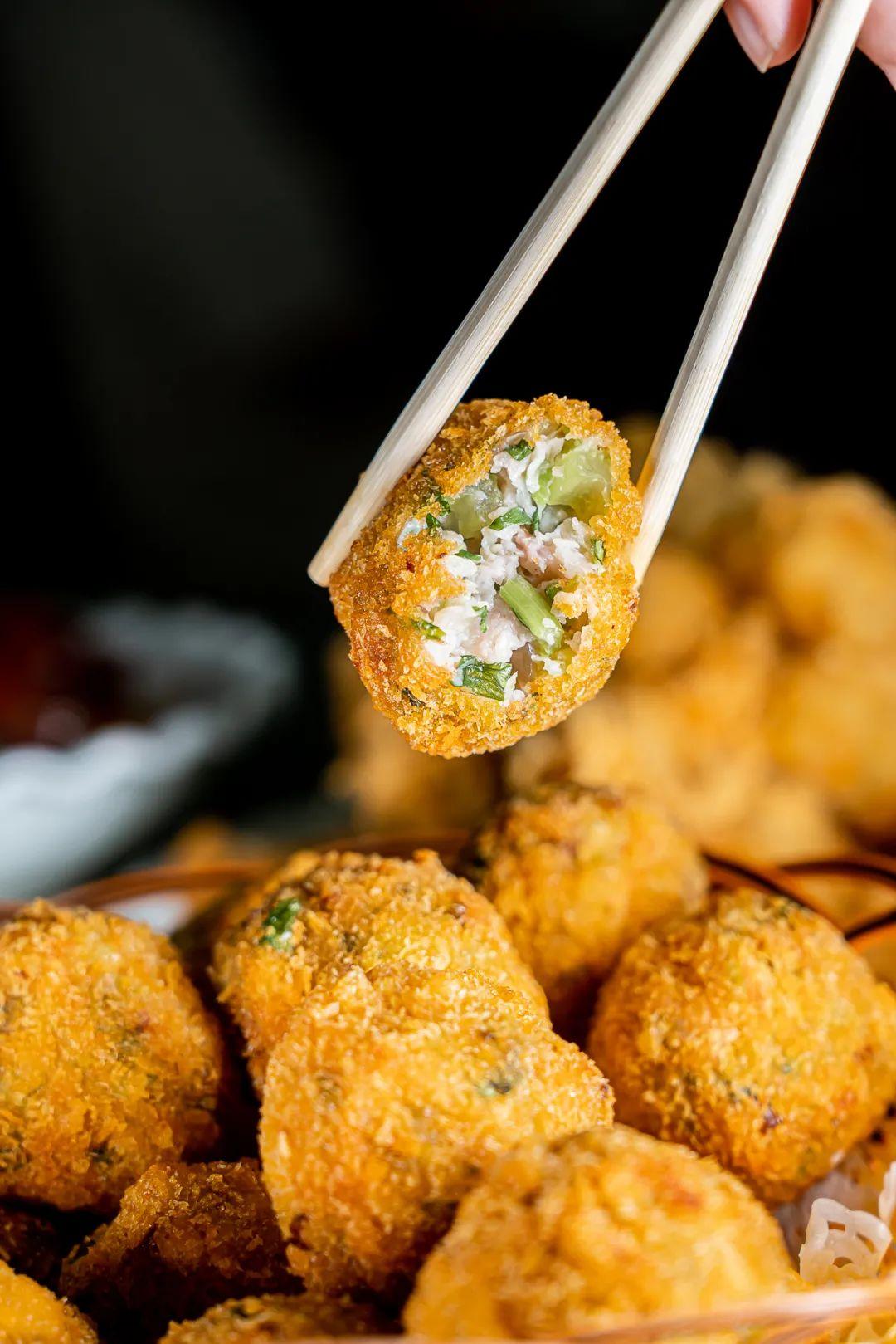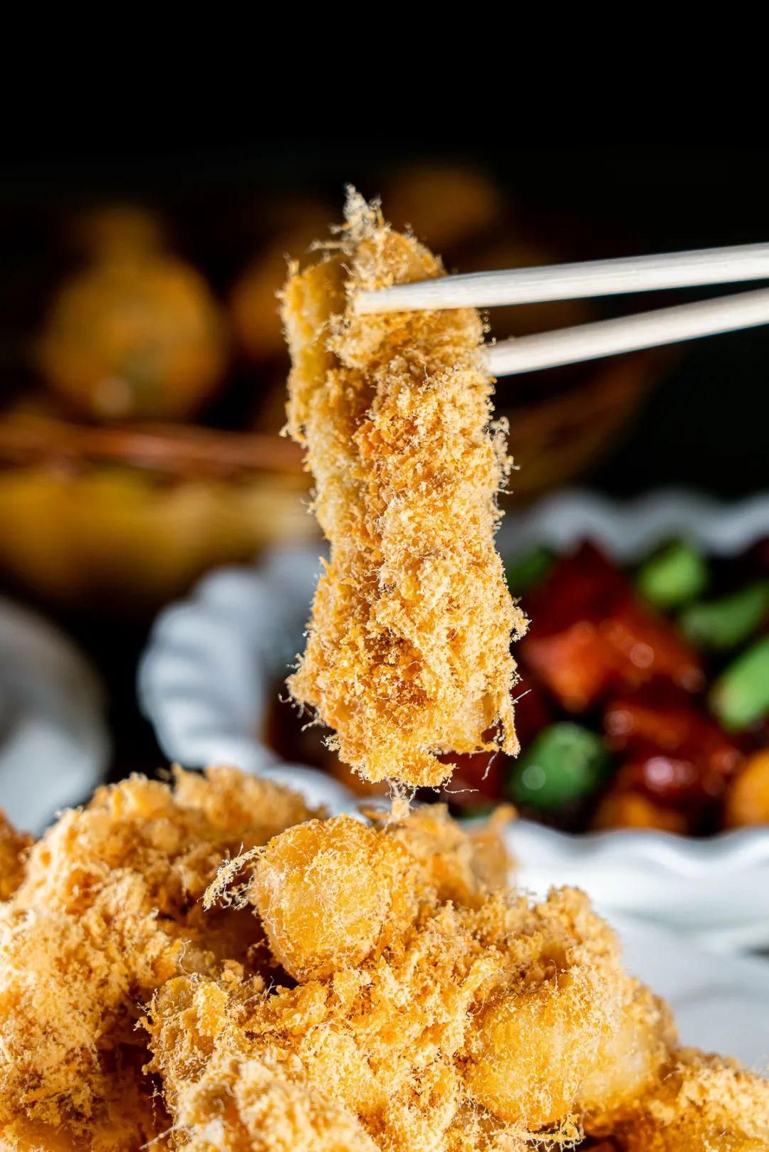 真的很离谱,看似魔性的搭配,却意外美味得令人食指大动,口不能停。炸至金黄酥脆的表皮,混着茄子的软糯和肉松的咸香,像是一道开胃甜品,惊艳四座。