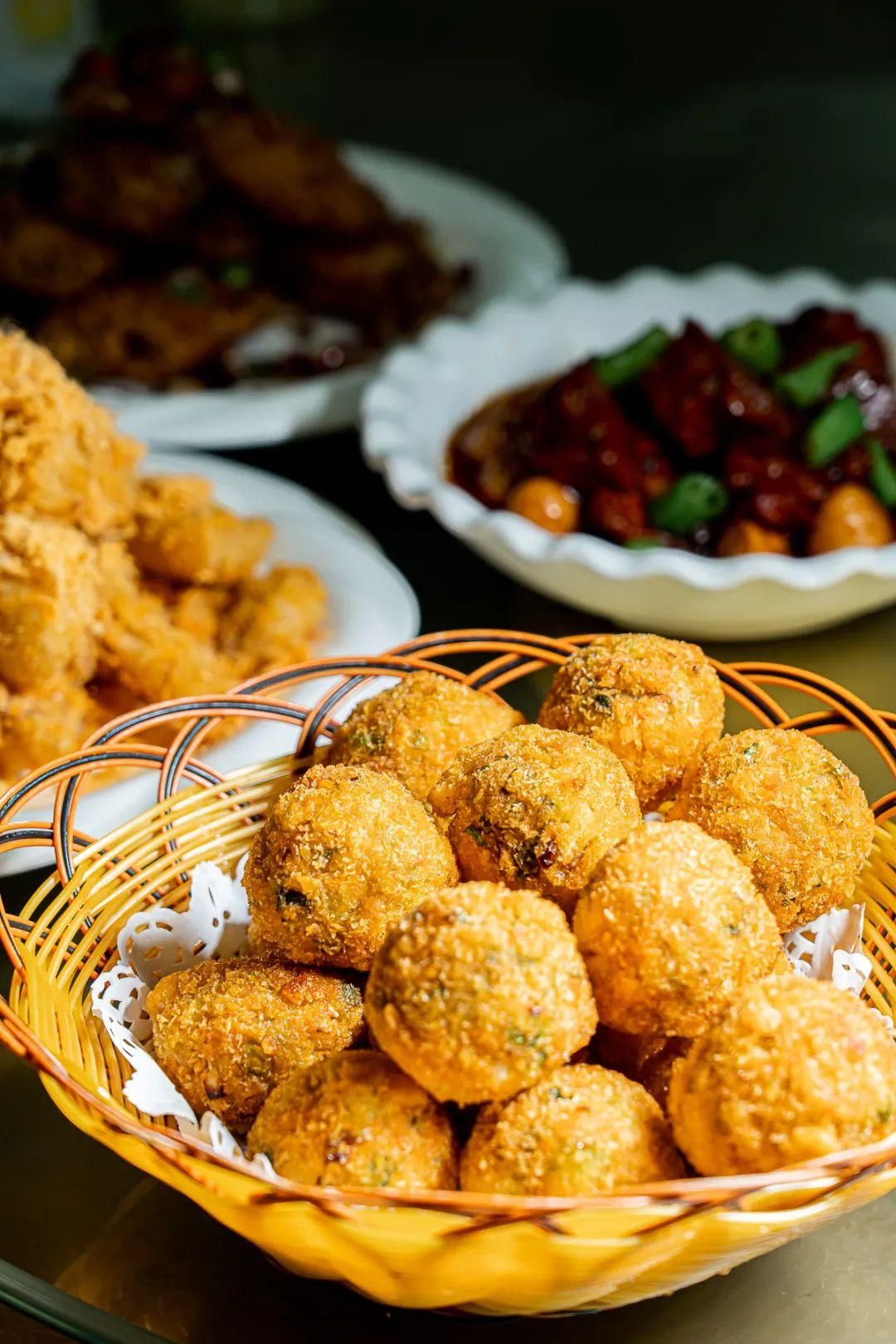 还有老板自创的蔬菜圆子,由芹菜、包菜等食材制作而成,肉很抛皮很脆,个头还大过乒乓球。