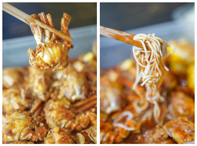 一个热知识,当蟹钳吃了一大半,记得加上热干面让师傅“回锅”一下,挂满了红油汤汁的蟹脚面,直接封神!
