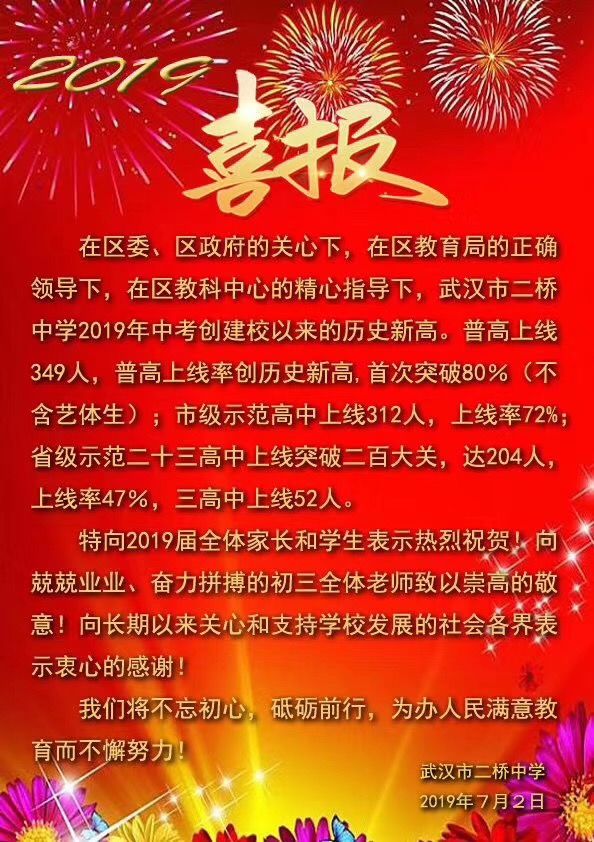 区教育局坚持推行“科学备考、人文备考、精细备考”。2019年中高考成绩继续稳居全市第一方阵。二桥中学2019年中考普高升学率勇夺武汉市公办初中第一名。