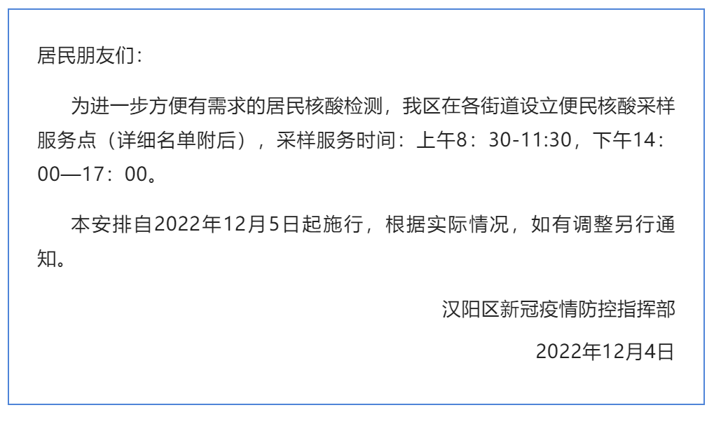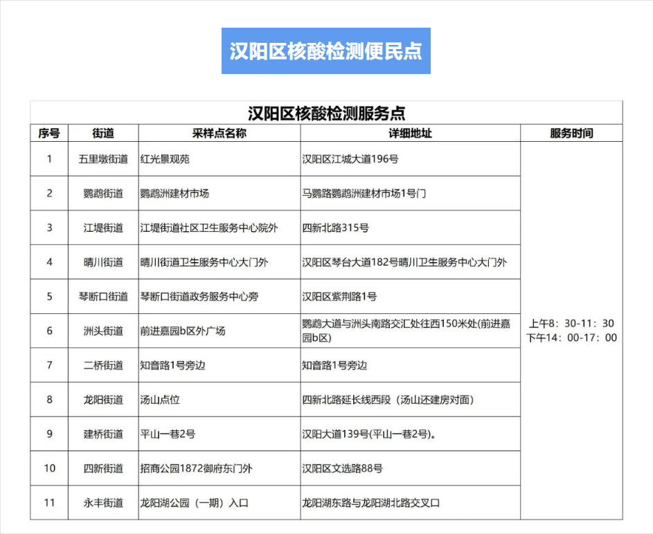 最新!汉阳区核酸检测点位调整 ©原创 2022-12-05 09:40 0 汉阳区内三家具备核酸检测能力的医疗机构,武汉市第五医院、武汉市汉阳医院、泰康同济(武汉)医院可提供24小时核酸检测服务。如居民因临时出差需要核酸检测结果,可选择前往医院进行自费检测。