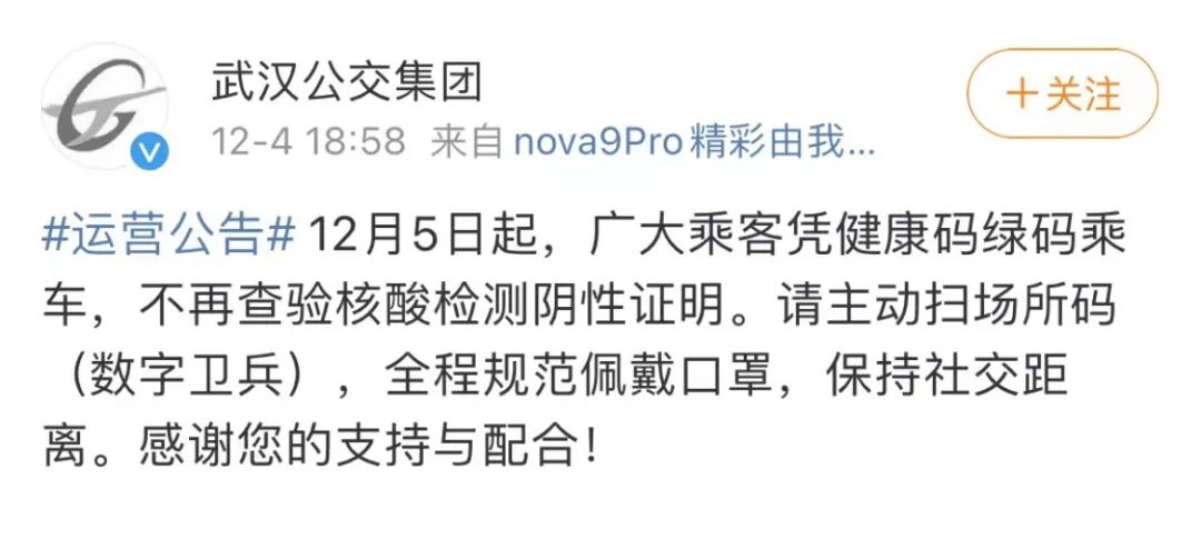 12月5日起,广大乘客凭健康码绿码乘车,不再查验核酸检测阴性证明。请主动扫场所码,全程规范佩戴口罩,保持社交距离。感谢您的支持与配合!