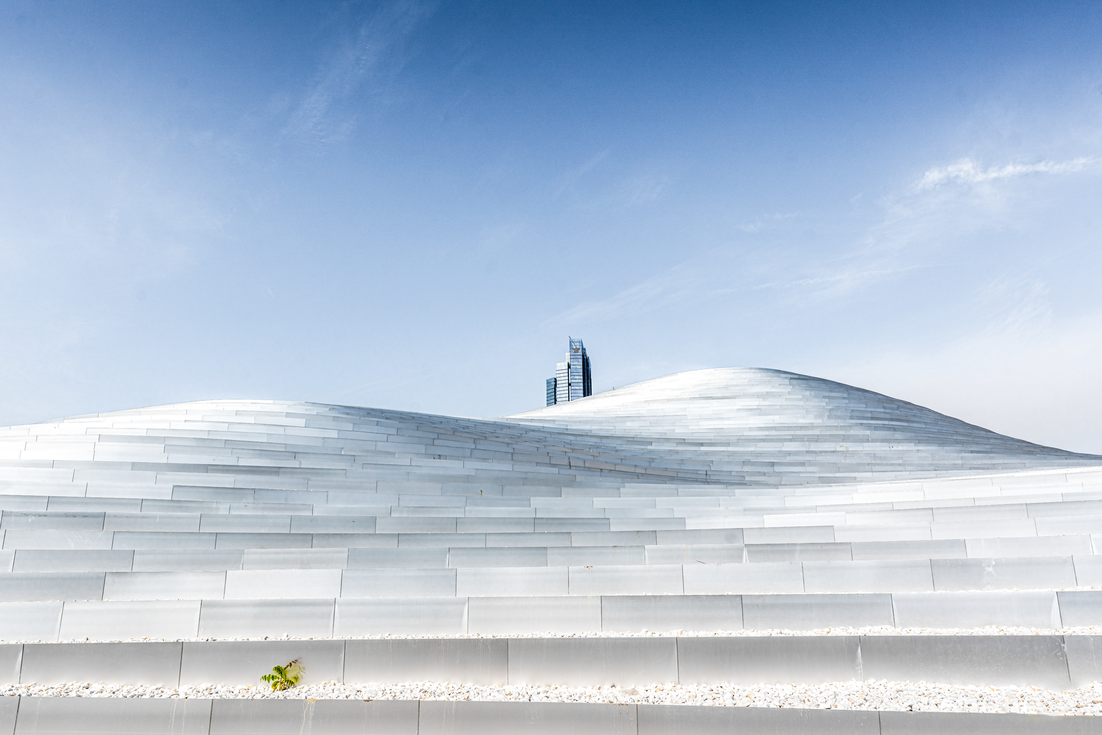 从高空俯瞰,美术馆在阳光下闪着银光,颇有“疑是银河落九天”的诗意。开放式屋顶,使它成为一座可全年、全天开放的艺术公园。