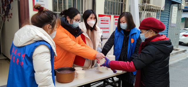 工作人员在社区红色驿站搭好桌子,将腊八粥一份份地递到老年居民、环卫工奶奶还有送报纸的爷爷手中,询问老人的身体状况,并送上节日问候。“喝上你们的腊八粥,新的一年有福喽。”陈爹爹说。