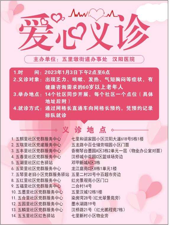 为满足重点人群就诊需求,解决基层群众就医难题,汉阳区五里墩街道将于1月3日邀请汉阳医院的医生进社区设点义诊,提供健康咨询、用药指导等医疗服务。