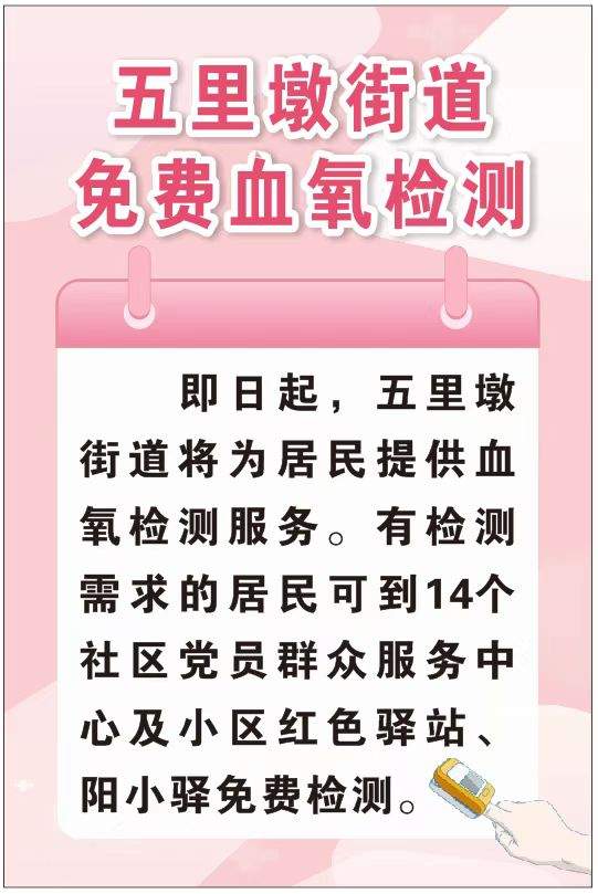 据悉,五里墩街道还将在14个社区的党群服务中心、红色驿站、阳小驿等82个公益性站点配备血氧仪,向小区居民、环卫工人、快递小哥等群体全天免费开放。