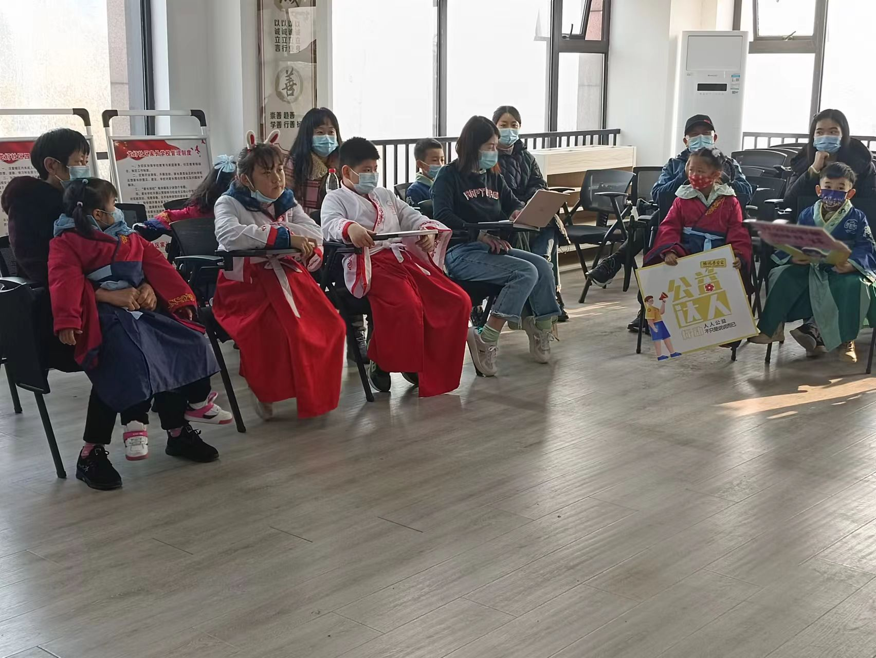 活动现场,孩子们在家长的带领下换上中华传统服装汉服,并手拿绘本,在现场老师带领下唱起《元日》。稚嫩的童声袅袅袭来,国学传承的氛围感瞬间拉满。