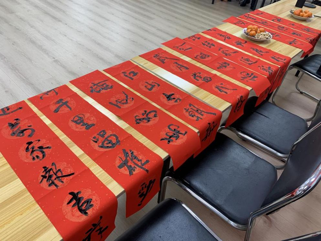 “民安国泰逢盛世,风调雨顺颂华年”“天地和顺家添财,平安如意人多福”...本次活动还邀请到书法爱好者朱师傅手写春联。只见他挥毫泼墨,运笔如飞,一幅幅寓意吉祥的春联跃然纸上。“随处都可以买到春联,但我们更喜欢手写春联,比在现成的对联更有年味。”居民王先生拿着带有余温的春联,爱不释手。