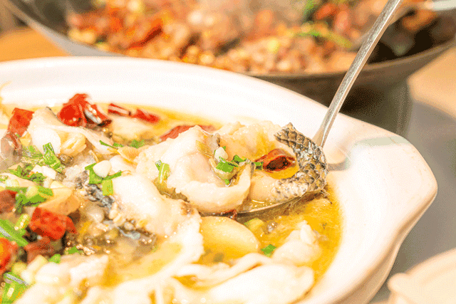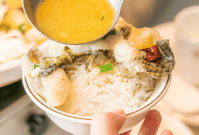 「酸菜黑鱼片」,金光闪闪登场。会吃的人一定会把汤汁浇在饭上,每一粒米都稀满酸辣汤汁,搭配鲜嫩鱼片,就算酸到眉头轻皱,也舍不得放下碗筷。