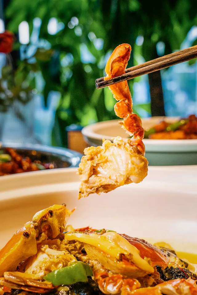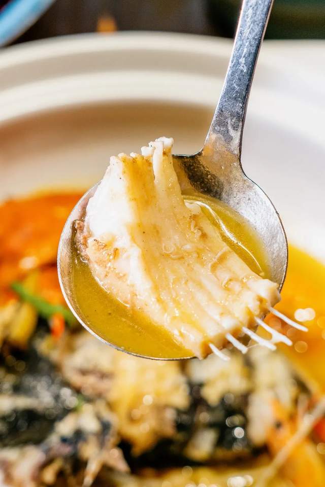 贴心的厨师已经将鱼头和肉分离,一向笨拙的我也能轻松夹起一整块鱼肉。肥美的螃蟹、鲜甜的虾,伴随一锅金灿灿的汤汁,完成一场美食邂逅。
