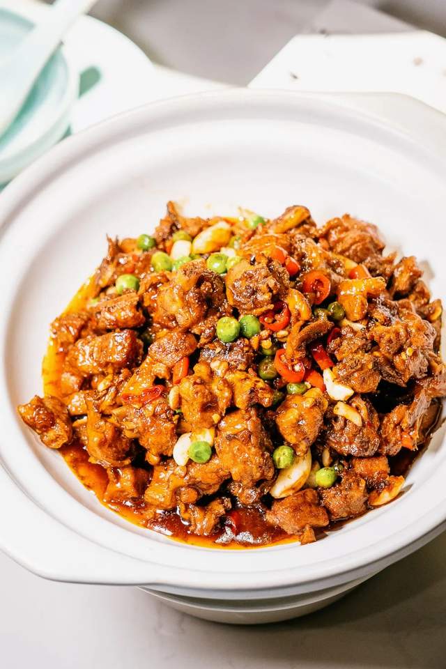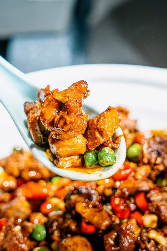 吃起来是甜辣口,鸭肉小而嫩,被料汁渗透,特别入味。