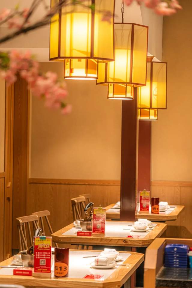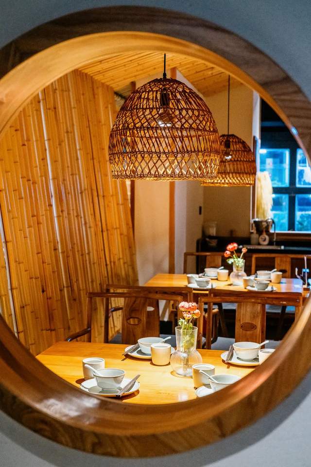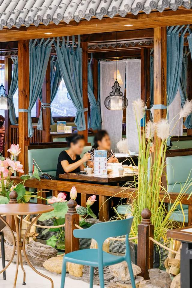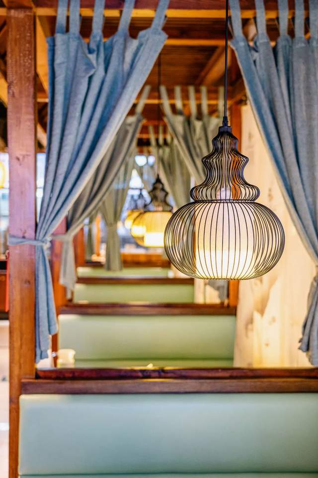 石桥,荷塘,青瓦灰砖,一挂挂的灯笼和蓝色亚麻帘,勾勒出一幅江南小桥流水荷塘图。