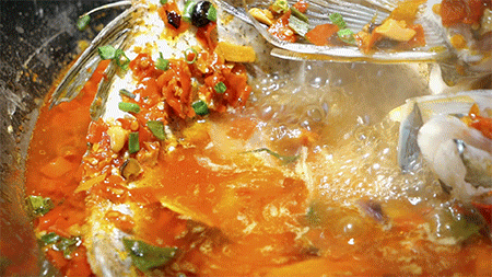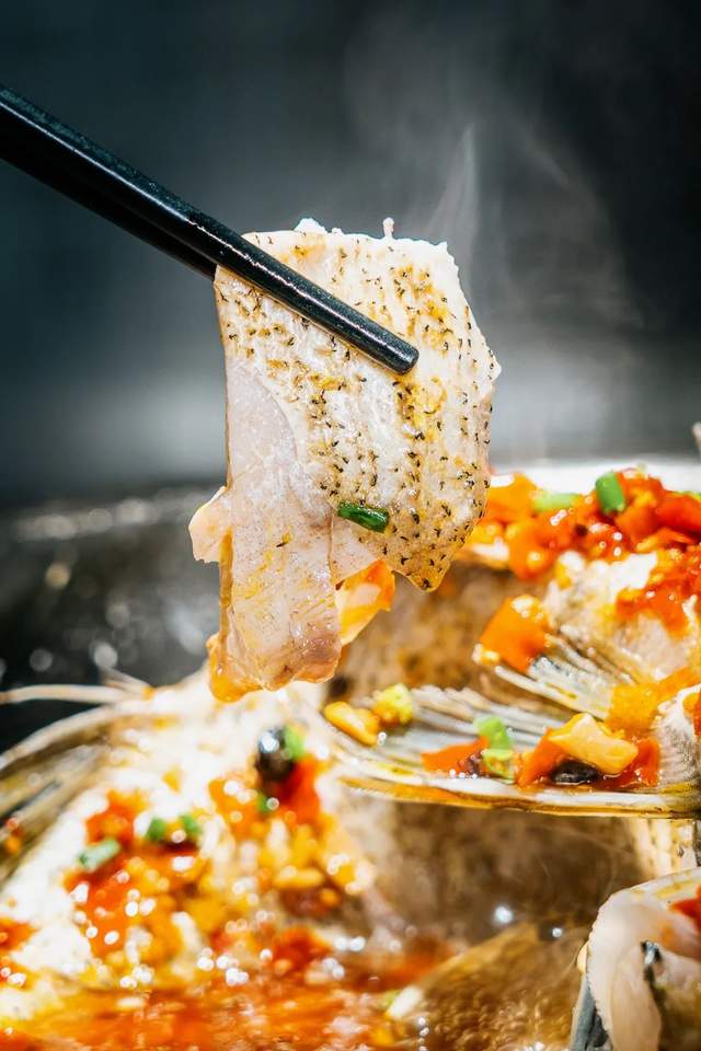 随着热锅加热,雄鱼由生变熟,剁椒的味道伴随鲜美的汤汁,吸附进鱼肉里,嫩得出奇!