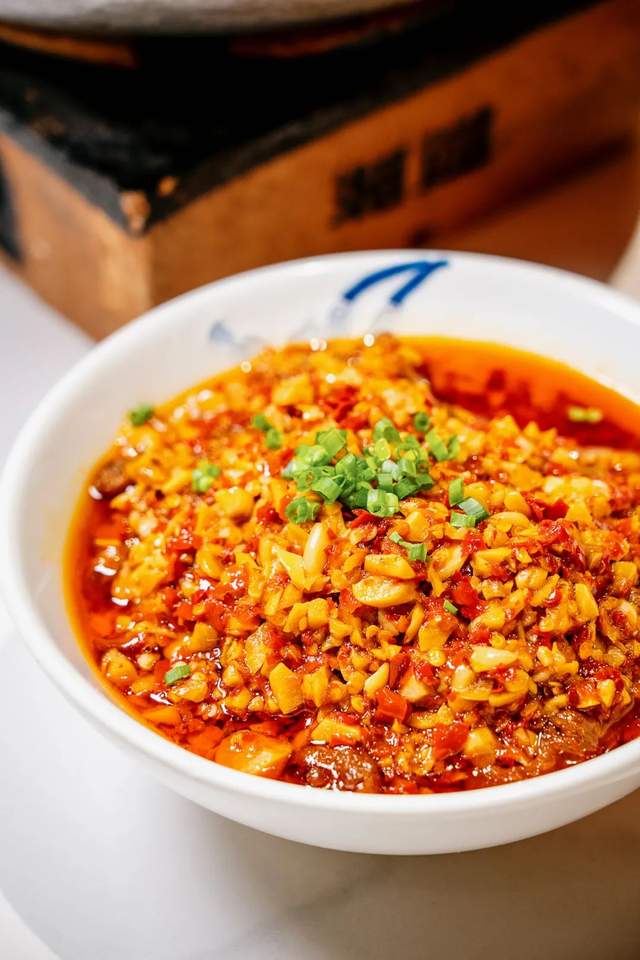 「浇汁虎皮凤爪」乍一看真的好像在吃辣椒。满满的蒜末和剁椒覆盖在鸡爪之上,看一眼味蕾就不自觉分泌口水了~