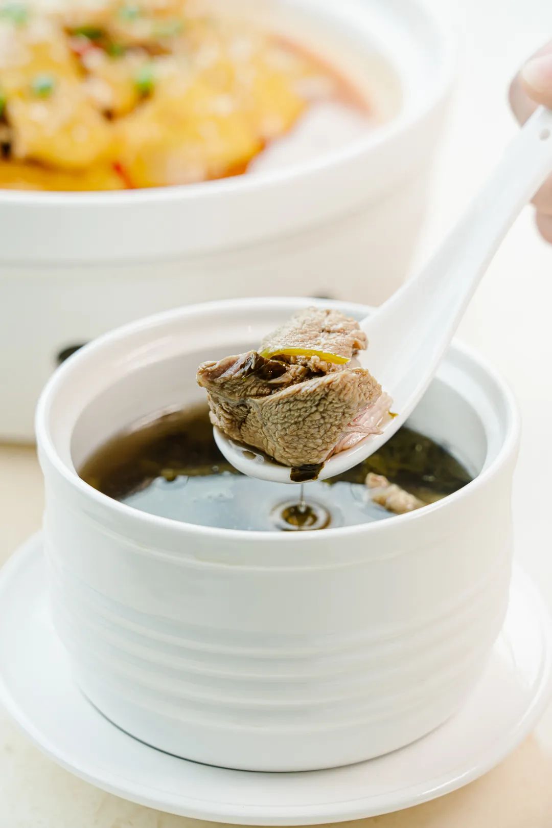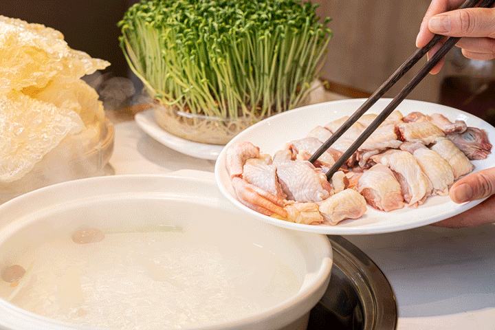 广东人对这道菜的要求,是汤鲜、肉好嚼,所以选择了肉质细腻的仔鸡,汤底也清晰可见的是一锅清水加少量配料。