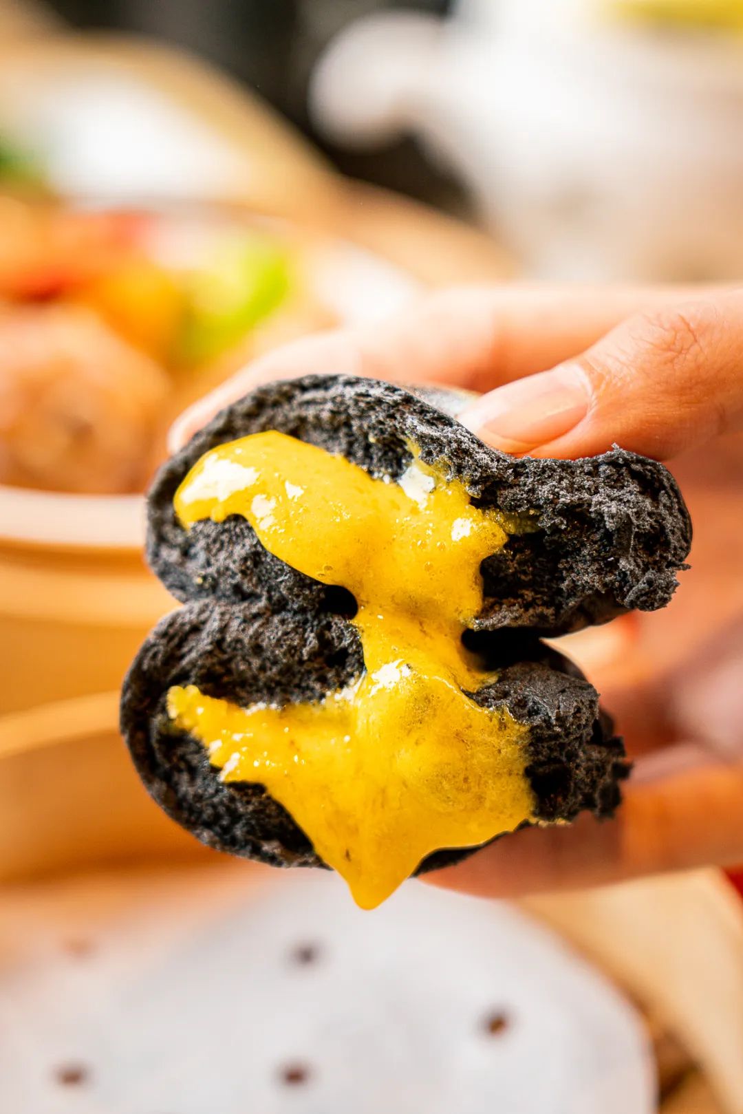 黑金流沙包也是一绝,表皮松软、麦香浓郁,趁热咬开,奶黄内馅在舌尖爆浆涌出,流沙的颗粒感接踵而至,甜滋滋的,久久不散。