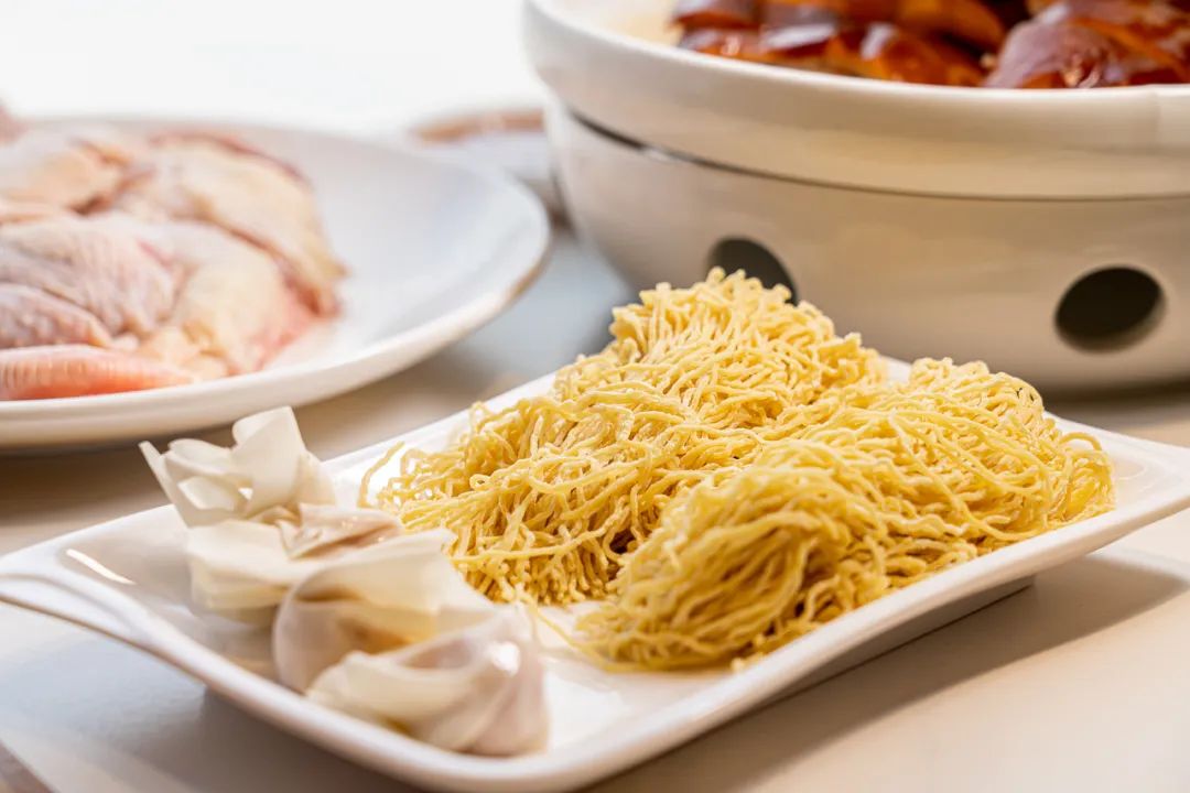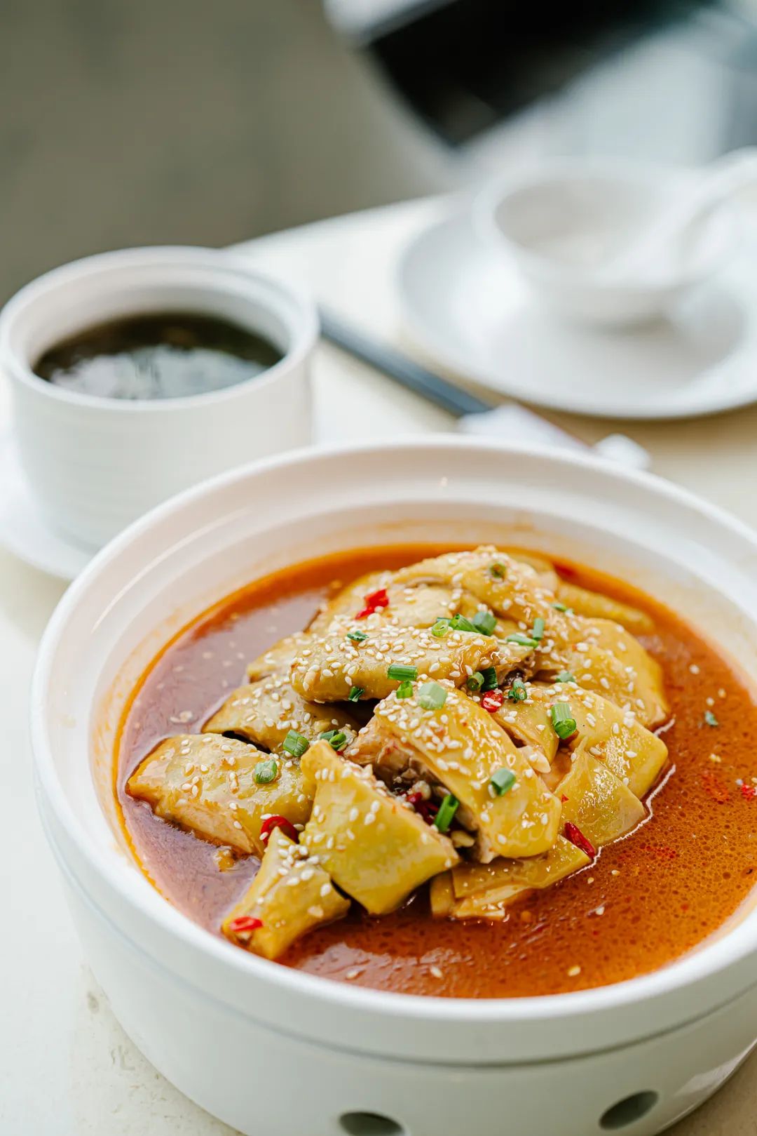 鸡肉不光不柴,蘸上姜蓉或是海鲜汁,有滋有味。还有特色的活体豆苗、顺德鱼丸、顺德竹升面,都很值得一试。
