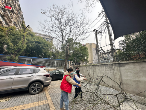 高空作业有很大的风险隐患,3月1日下午3点,供电工作人员来到现场,用锯子割去较长的树枝,社区工作人员一起在现场帮忙扶梯子,捡树枝,并通知保洁人员及时将树枝进行拖运,解除隐患的同时保证居民的生活环境,在社区与供电的友好协作下,顺利完工,及时消除与居民生活息息相关的变压器安全隐患,获得居民满意评价。