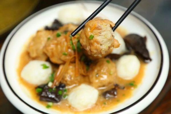 圆子选料严谨,只用农家土猪肉以及两斤半到三斤的草鱼,工序虽繁,却都手工制作。“一斤肉,加4两左右的鱼茸,如果喜欢膨胀的口感,还可以多加点马蹄,这样香气更加浓郁。”