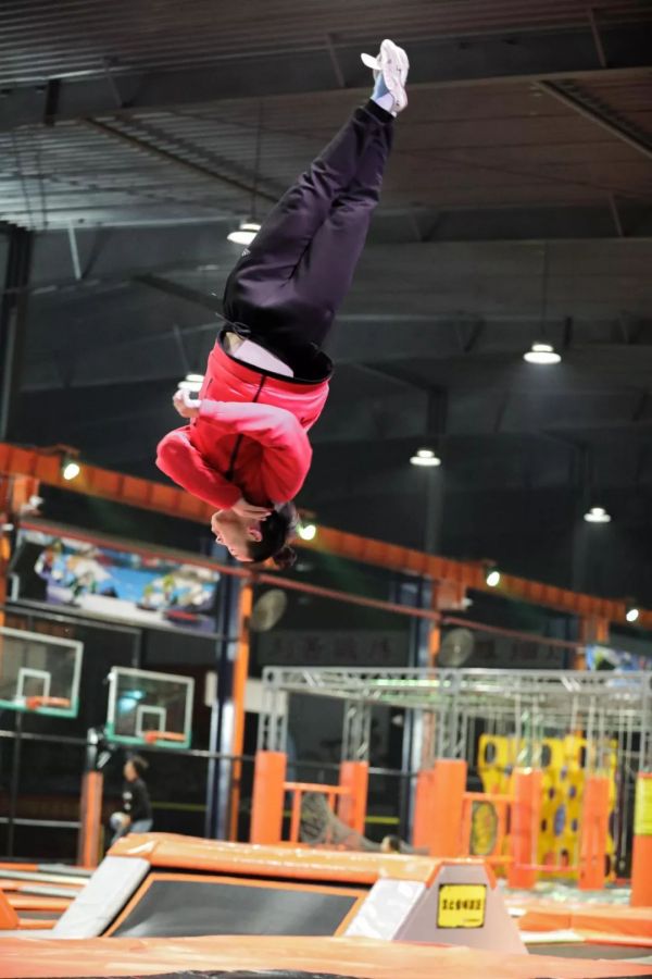 ▼运动馆的网红项目,在蹦床上扣篮球、粘在半空中,以及飞檐走壁。