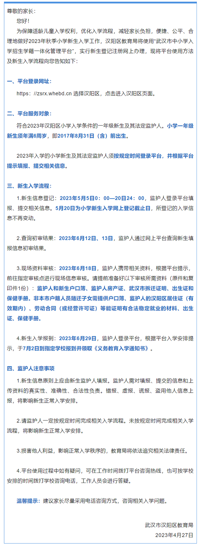 汉阳区2023年小学新生入学工作
