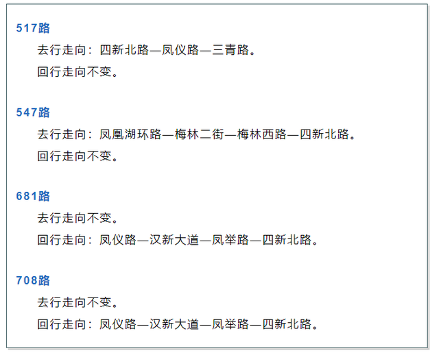 根据公告,因新区道路改造工程,凤仪路、风举路交管实施单向通行,为方便市民出行,拟从2023年5月6日起,临时调整公交517、547、681、708路部分线路走向。凤举路四新北路南行公交站点临时向前迁移160米。详细走向如下: