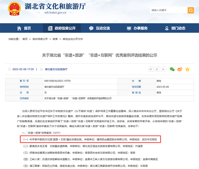 近日,湖北省文化和旅游厅公示我省“非遗+旅游”(12个)“非遗+互联网”(8个)优秀案例评选结果,武汉2个案例入选,汉阳区报送的“叶开泰中医药文化园‘国医+文旅’融合发展实践”案例上榜“非遗+旅游”优秀案例12强。