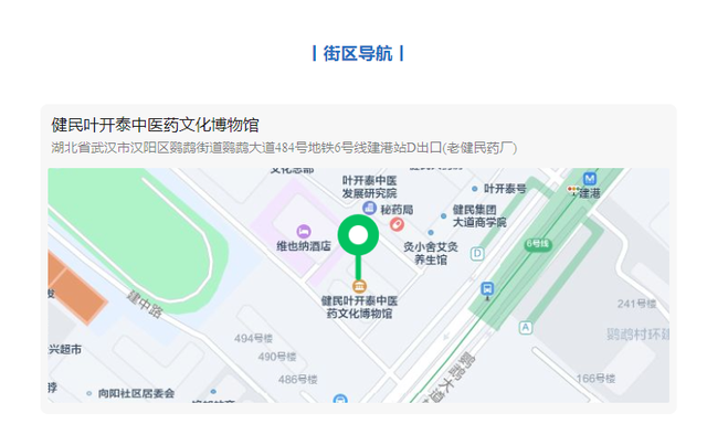 街区下设叶开泰中医药文化博物馆、叶开泰中医发展研究院、健民大药房、叶开泰国医堂、叶开泰生活坊、当归中医学堂、灸小舍等多个场馆。