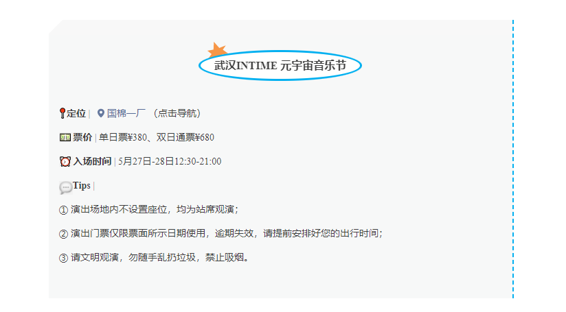 入场时间为12:30,检票时,需要各位乐迷携带好自己的随身物品及元宇宙音乐世界通行证 (门票)有序进入验证登录区,验证通行证后即可开启奇幻畅爽的音乐体验。
