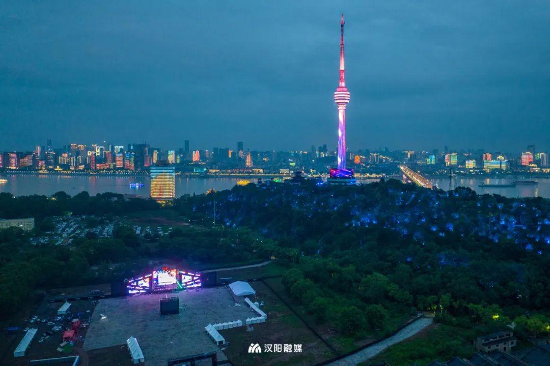 音乐节场地背靠长江,左手龟山右手汉水,植与水相拥,盎然绿意隔出一个野趣十足的户外蹦迪场。抬头远眺,龟山电视塔近在咫尺,入夜炫彩灯光裹身,未来感十足。