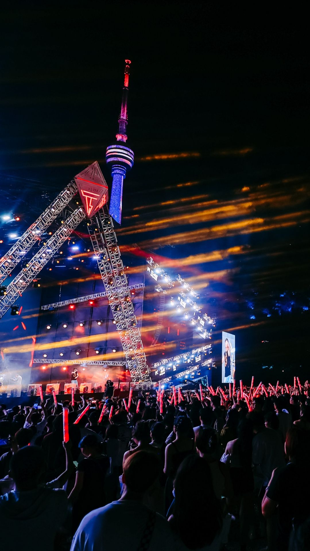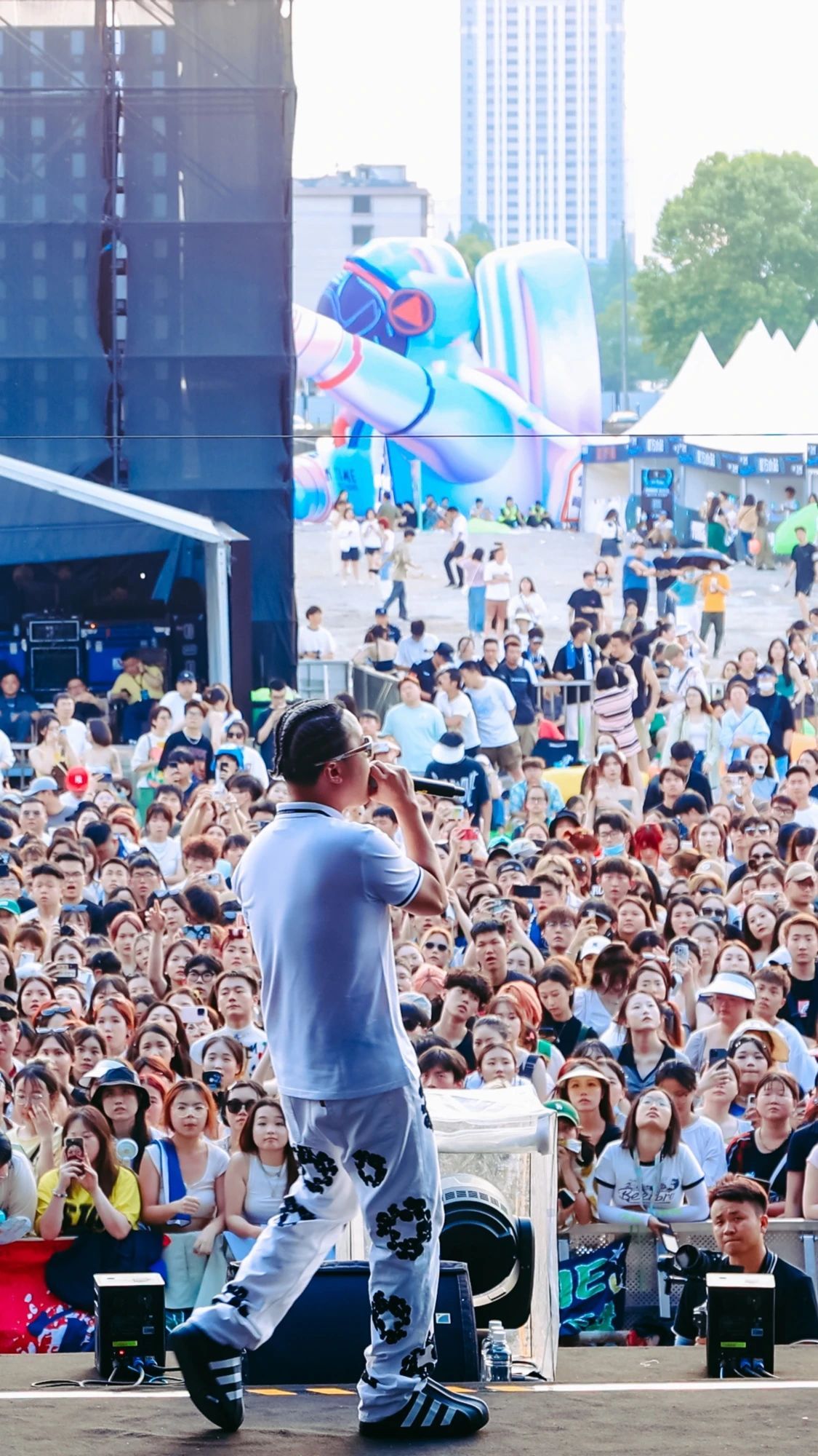 音乐节场地背靠长江,左手龟山右手汉水,植物与水相拥,盎然绿意隔出一个野趣十足的户外蹦迪场。抬头远眺,龟山电视塔近在咫尺,入夜炫彩灯光裹身,未来感十足。