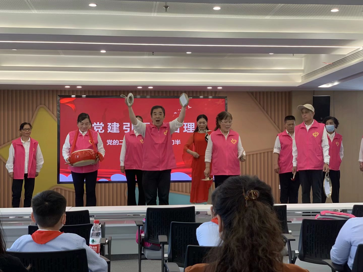 活动现场,红建社区“红小二”理论宣讲队现场表演三句半《党建引领强治理》,组织党员开展红歌联唱。夏明翰小学的师生带来的舞台剧表演《孔融让梨》等节目引得观众阵阵掌声。
