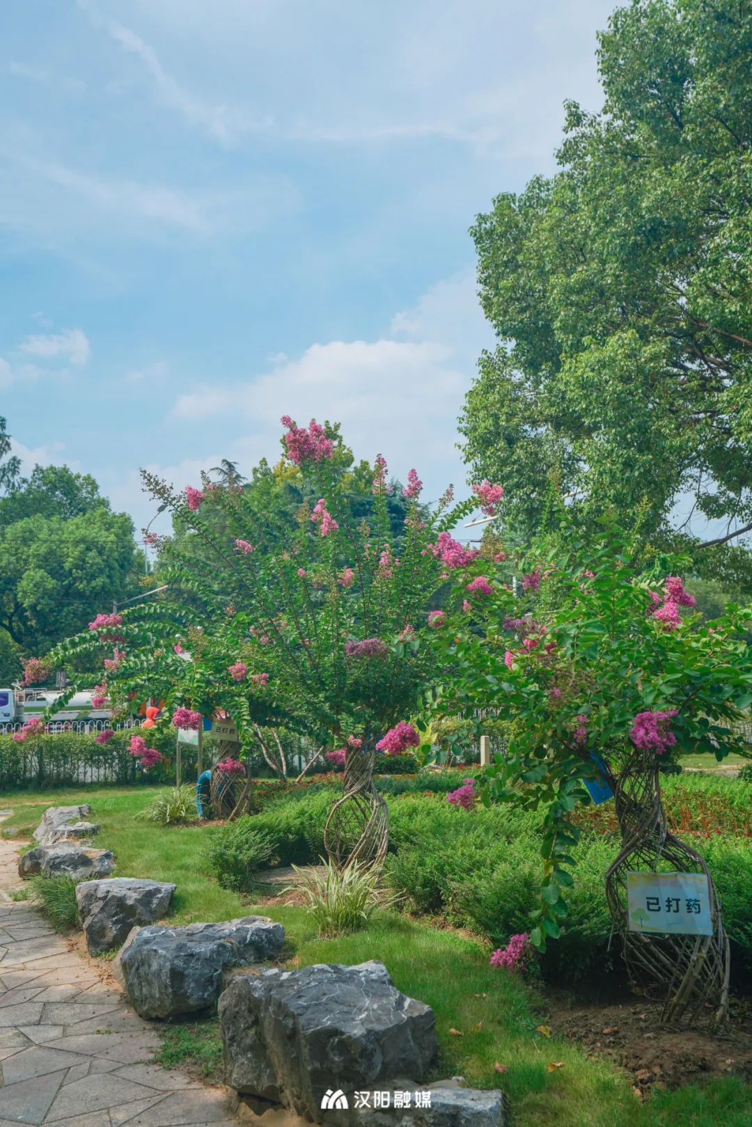 「琴台绿化广场」里还有许多造型独特的紫薇,有的被“装”进花瓶里,有的零星点缀着花坛景石,还有的被“盘”成了中国结,让人眼前一亮。
