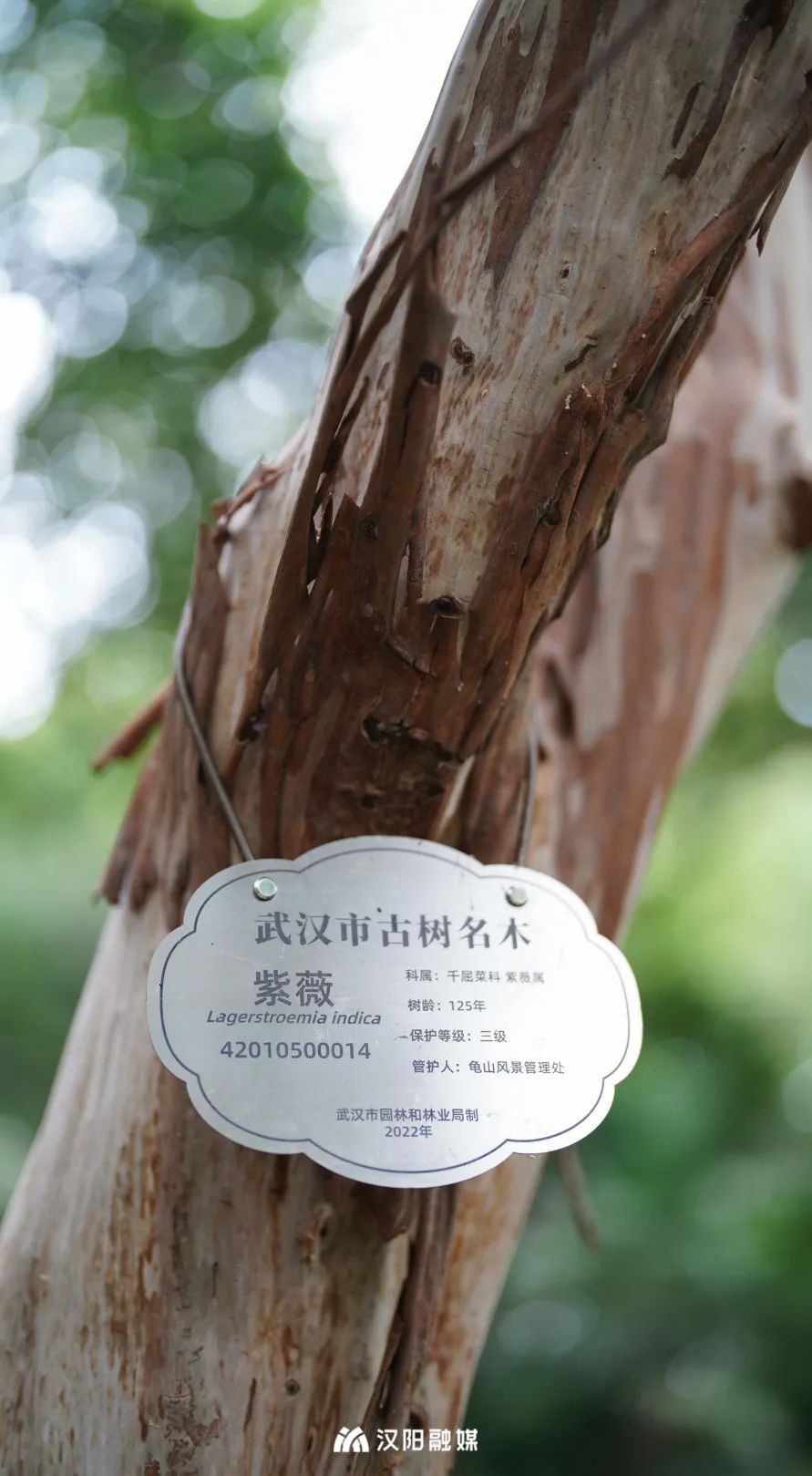 这株紫薇古树位于龟山风景区「楚月桥」旁,高达11米多,足有3层楼高,胸径140.1厘米,编号42010500014,树龄已达125年,是龟山最大、最年长的紫薇。