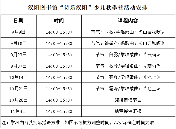地点:汉阳区图书馆三楼活动室学习教材:每个学员节气绘本1本,教材1本。学习内容:(1)6个秋季传统节气知识和典故(2)6个秋季相关节气古诗词的朗诵与品鉴(3)3首秋季节气相关诗乐歌曲的演唱通过8次课程,掌握科学的歌唱呼吸、发音咬字、诗词理解、旋律节奏以及演唱情感。