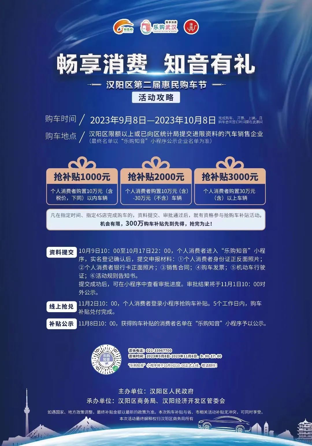 9月8日,畅享消费,知音有礼——汉阳区第二届惠民购车节正式启动。9月8日至10月8日期间,个人消费者在汉阳区限额以上或已向区统计局提交进限资料的汽车销售企业(名单附后)购车,在享受商户折扣优惠同时,最高可获得政府3000元现金补贴。