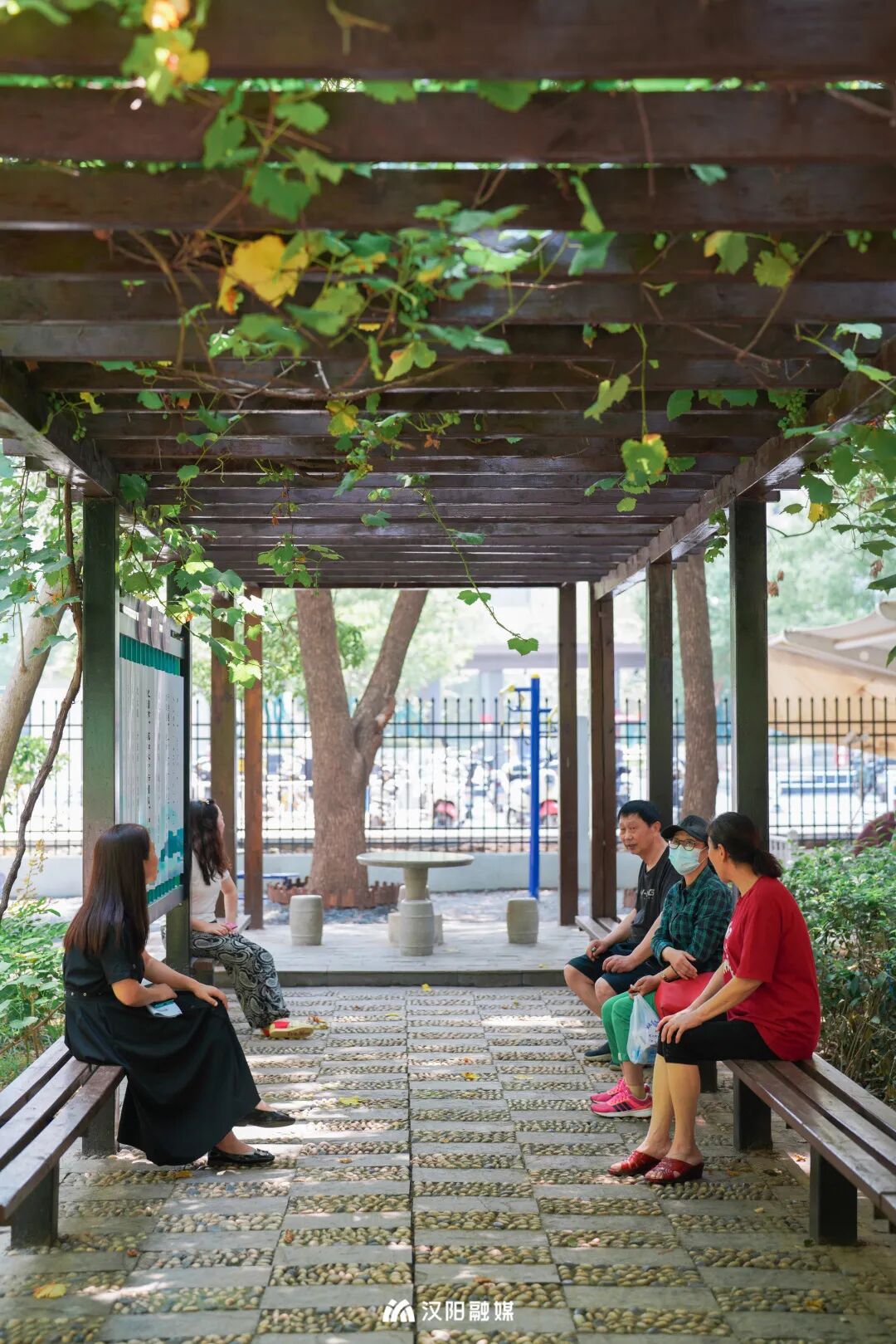 运动设施增添的同时,社区在征集居民建议后,对休息长廊也进行了一番修整。在葡萄藤攀附的长廊下,居民们聚在一块谈笑风生。