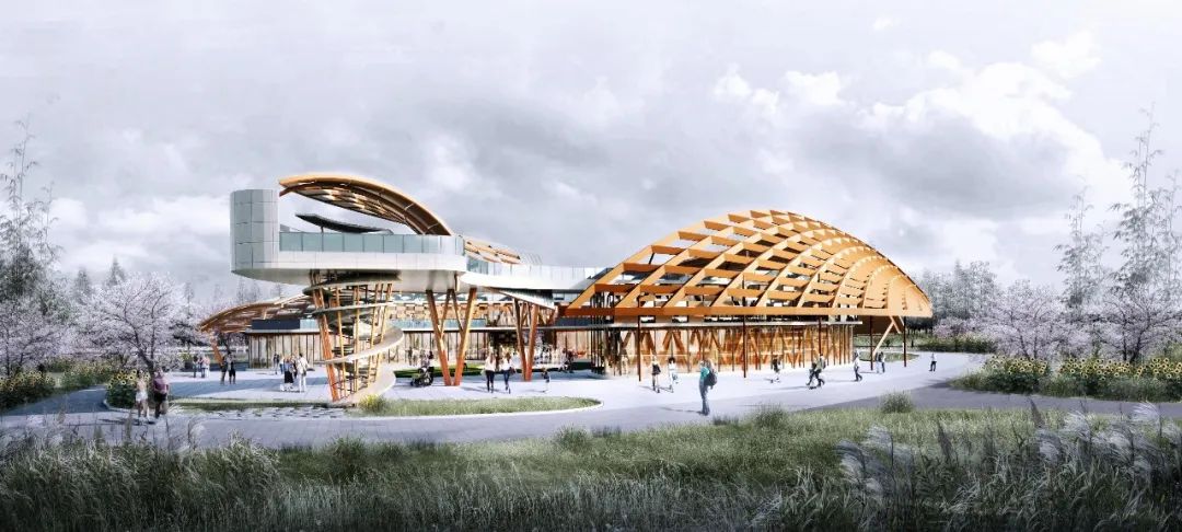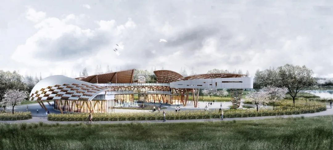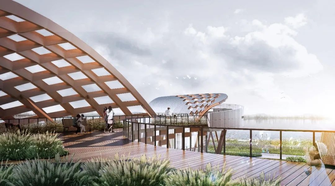 根据“活水跃游龙”方案,水生态科普馆宛如游龙,盘踞在湖岸边,屋面整体由环保材料胶合木网架和钛锌板构成,让视觉感官上也较为轻薄。完整建筑形态还能进行将雨水收集和净化,成为灌溉及景观用水,让水生态科普馆的特性更加凸显。