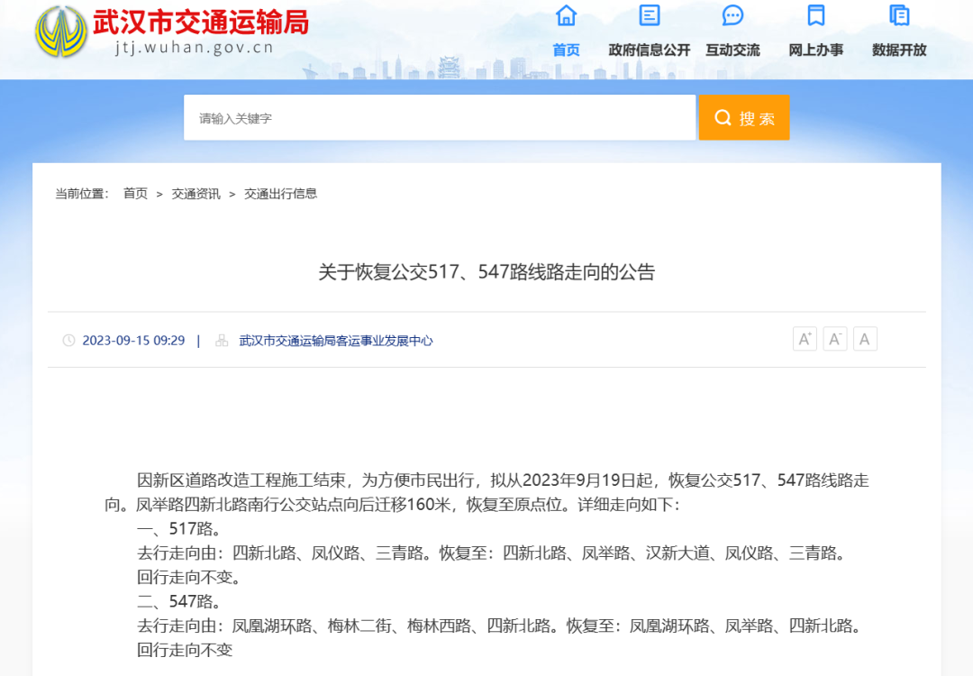 因新区道路改造工程施工结束,为方便市民出行,拟从2023年9月19日起,恢复公交517、547路线路走向。凤举路四新北路南行公交站点向后迁移160米,恢复至原点位。详细走向如下: