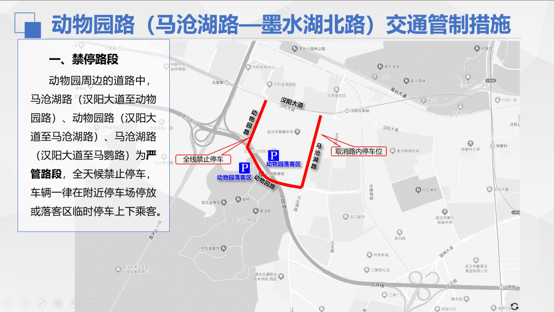 武汉交警提醒,动物园周边道路动物园路(汉阳大道—马沧湖路)、马沧湖路(汉阳大道—马鹦路)为严管路段,全天候禁止停车,车辆一律在附近停车场停放或落客区临时停车上下乘客。