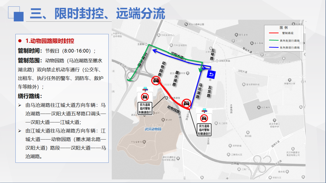 周六、周日、法定节假日(8:00—16:00),动物园路(马沧湖路—墨水湖北路)双向禁止机动车通行,公交车、出租车(含网约车)、执行任务的警车、消防车、救护车等除外。游园高峰时段,视情对武汉动物园周边道路及二环线下马沧湖路匝道临时交通管制。